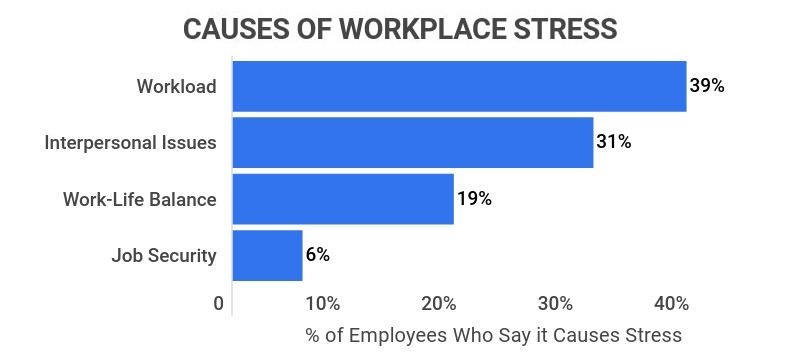 According to another U.S. study of 2,000 workers, the top causes of workplace stress in the United States are workload (for 39% of workers), interpersonal issues (31%), work-life balance (19%) and job security (6%).