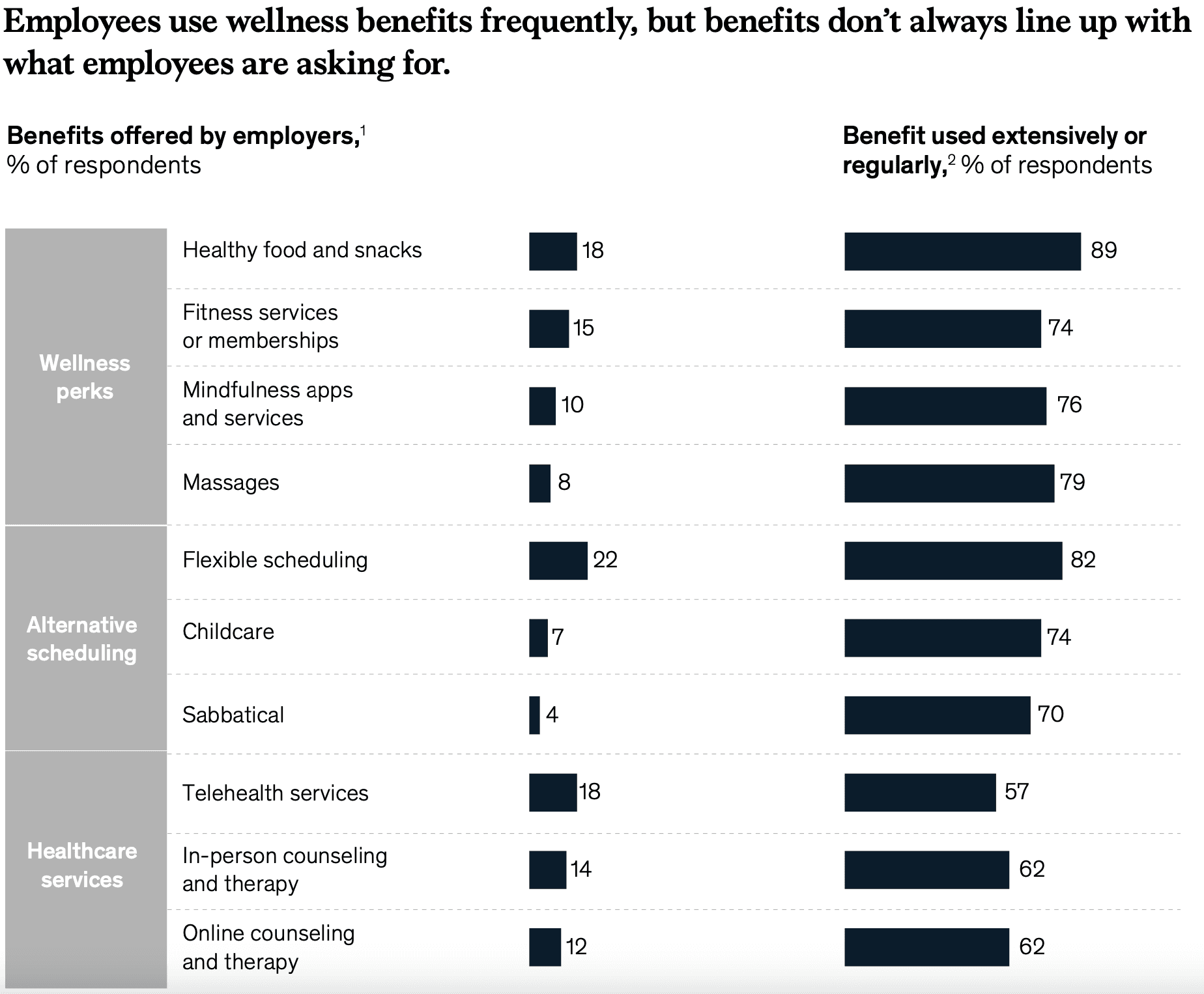 While 22% of employers offer flexible scheduling to their employees, only 10% offer mindfulness apps and services.