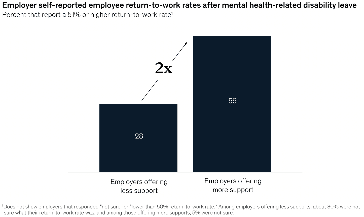Similarly, according to McKinsey & Company surveys, by the end of 2020, the rate of employees returning to work after a mental health-related disability is over 50% for employers who offer more mental health support compared to employers who offer less support.
