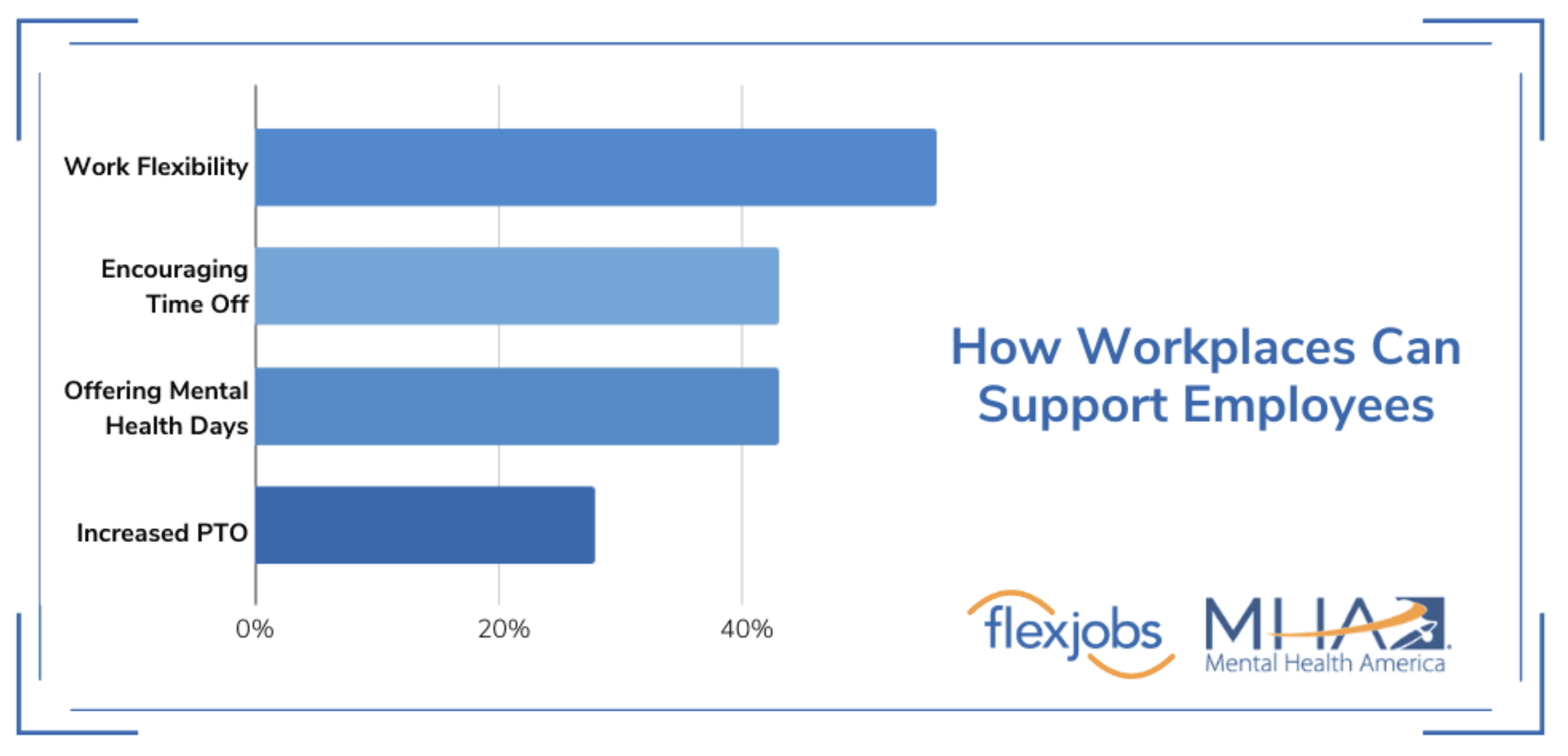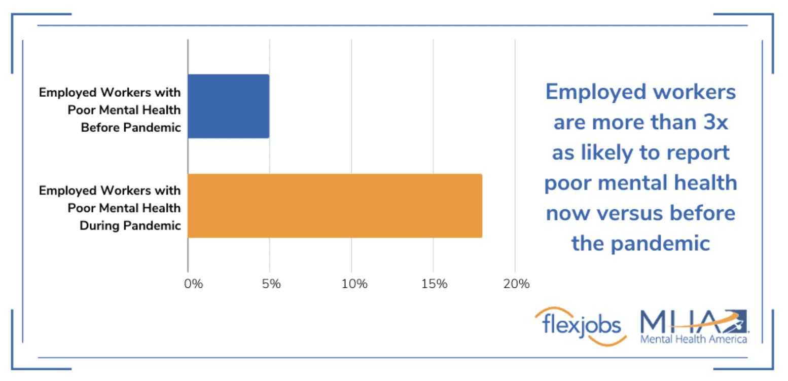 A lack of support in the workplace can have a negative impact on workers’ mental health in addition to already difficult circumstances. According to FlexJobs, only 5% of employees and 7% of the unemployed described their mental health as poor or very poor before the pandemic. Now, 18% of employees and 27% of the unemployed say they struggle with mental health issues.