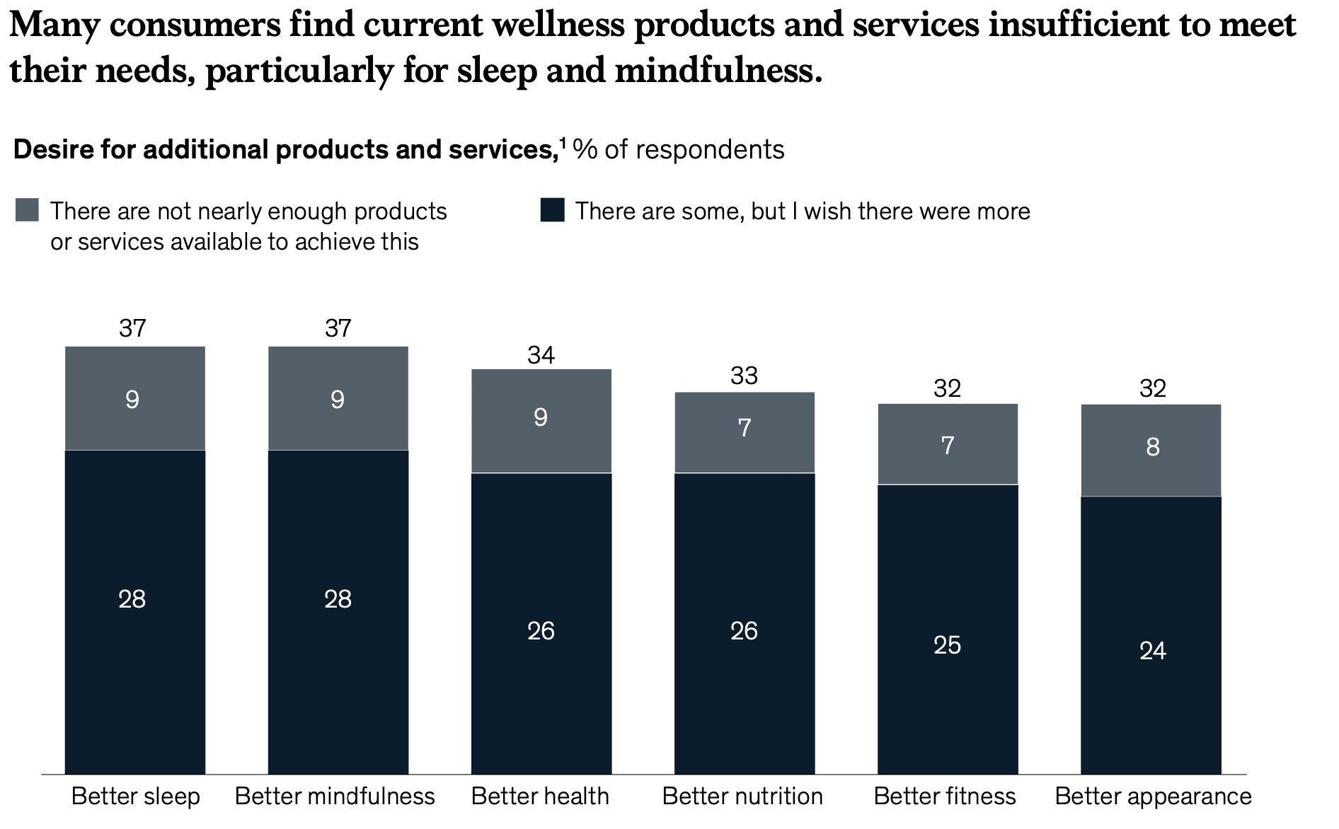 About 37% of consumers surveyed want additional products and services in the areas of sleep and mindfulness, and nearly one-third of customers also want more in the other four wellness dimensions.