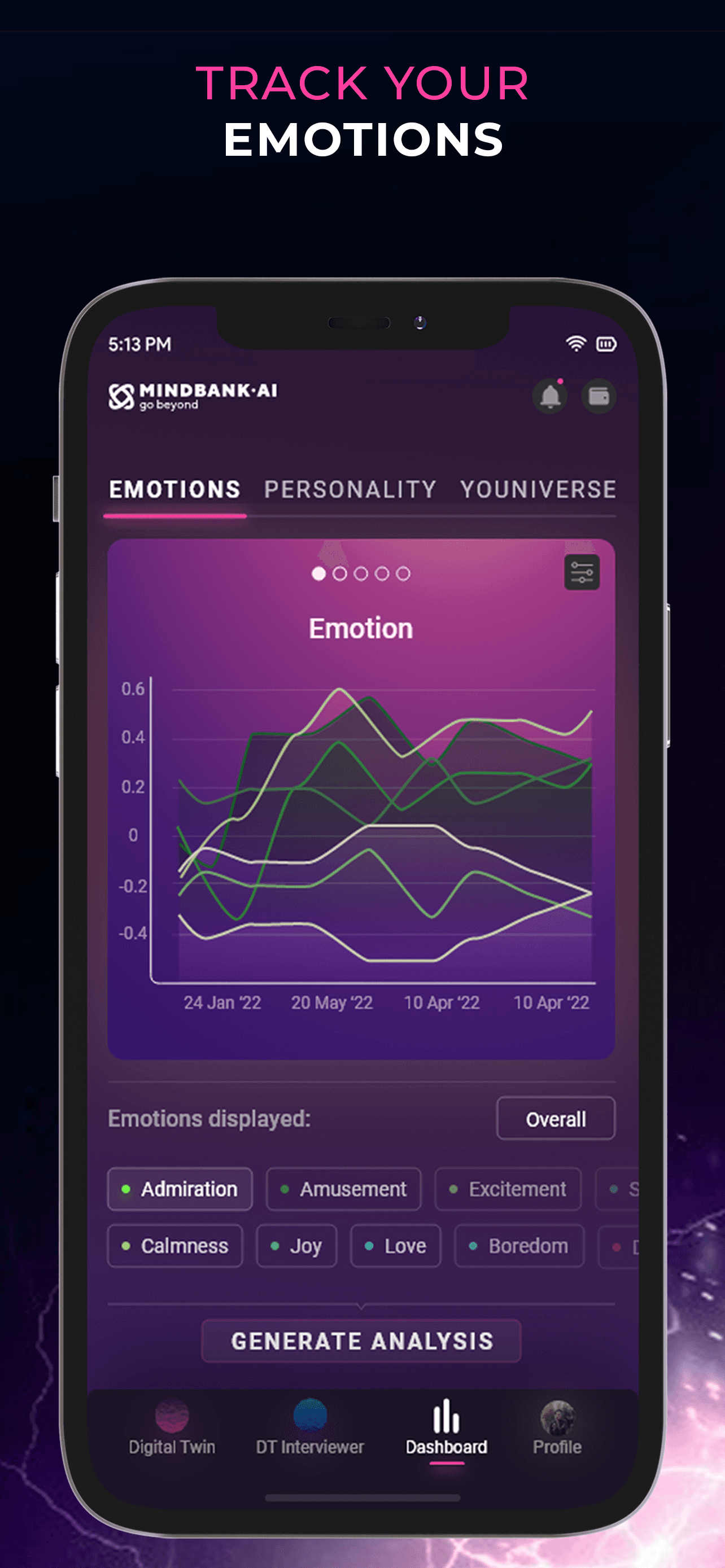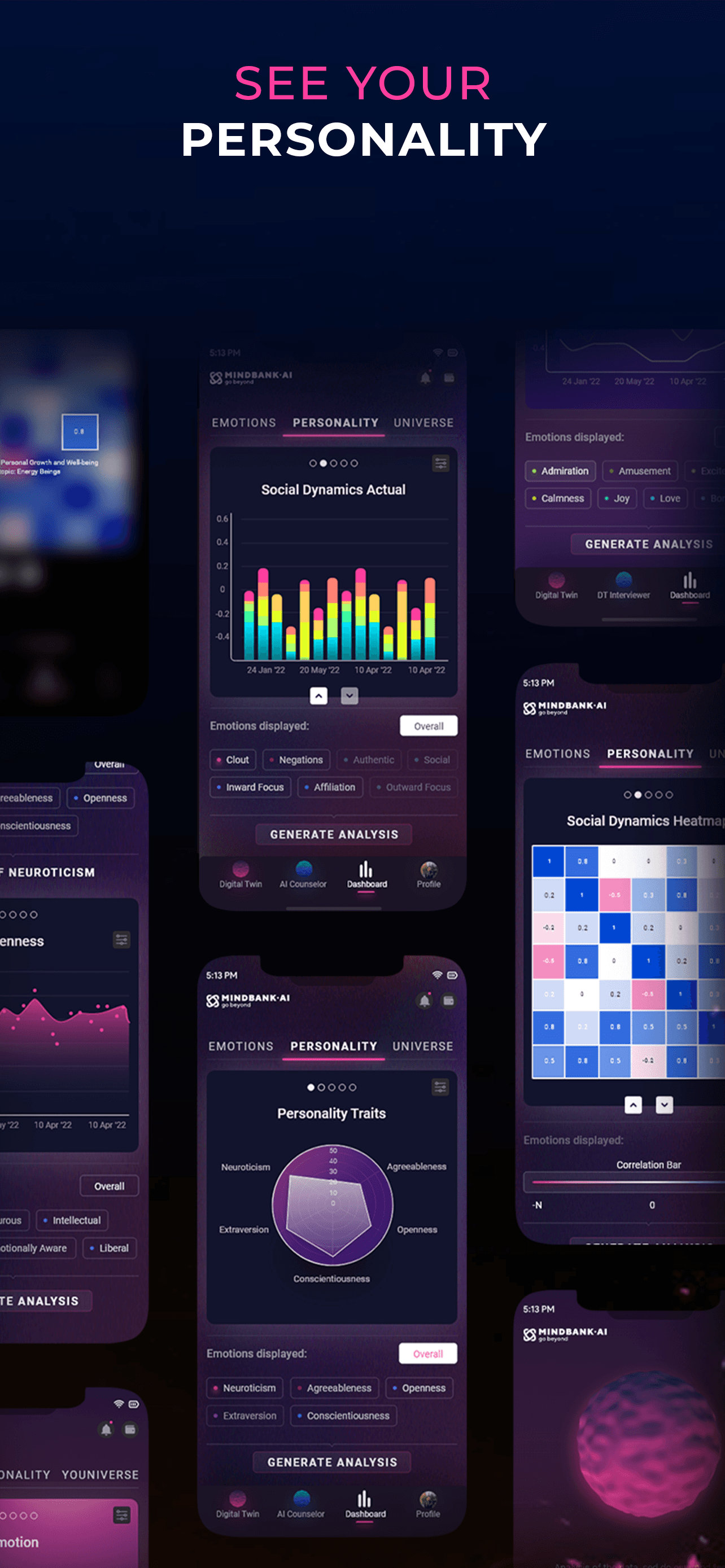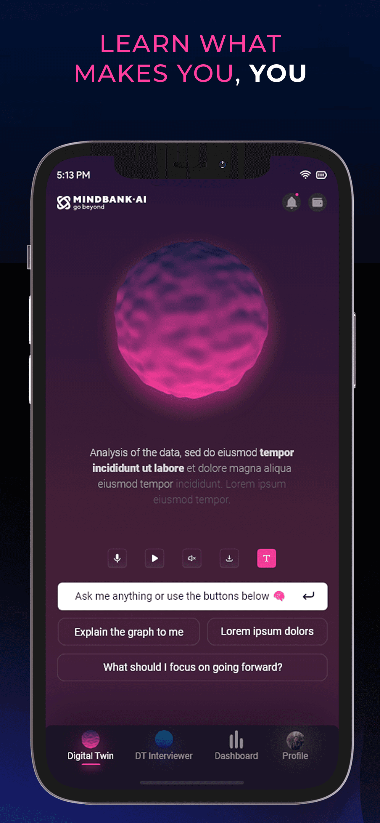 The existing mental health tools are used among different age groups and aim to prevent disorders by providing knowledge or engagement. The Internet offers you a variety of apps and platforms, but how do we know which is best for us?Mind Bank Ai is a perfect starting point if you wish to gain mental strength and unlock your infinite potential. Just like a fitness app for your mind, your Personal Digital Twin will help you visualize your progress as it asks you questions every day. With each question it learns to think like you by analysing your answers while revealing insights about your cognitive state. The goal is that you create a digital twin that eventually “becomes” you. Your personal digital twin can help you understand different aspects of your mind, help you grow through self reflection and ultimately live forever through data.